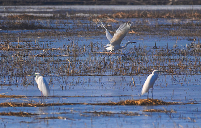 4月1日,有20多只白鹭在包钢尾矿湿地里飞翔、嬉戏、觅食,为湿地增添了勃勃生机(如图)。据了解,白鹭是国家二级保护动物,而黄嘴白鹭更是被列为国家一级重点保护动物。白鹭在维护生态平衡和生物多样性方面具有重要作用,被称为“环保鸟”,其数量变化可以反映环境质量状况。近年来,包钢从矿产资源保护、水资源循环利用、周边生态环境修复等多个维度,持续加大对尾矿库边坡及湿地环境的治理力度,努力将其改造成工业生产、环境调节等多种功能兼具的城市湿地。(贺雅楠/文白立新/摄)