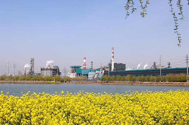 清明小长假期间,晋南钢铁太子湖光伏园区的油菜花陆续盛开,金色的油菜花和钢城相映成趣,奏响春天绿色交响曲。图为从太子湖光伏园内遥看厂区。(丁卫国摄)