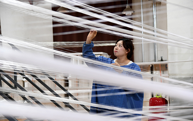 5月18日是第35个全国助残日,今年助残日的活动主题是“弘扬自强 与助残精神,凝聚团结奋进力量”。多年以来,中国宝武太钢始终高度重视残疾人事业,积极探索残疾人就业新模式、新路径。太钢福达公司(原太钢福利厂)自1984年成立以来,已累计安置近1100多名残疾人就业。太钢福达公司被山西省残疾人联合会命名为全省首批“残疾人就业创业”基地。图为5月14日,太钢福达公司职工在进行工业用吊带生产作业。(记者 王旭宏 摄)