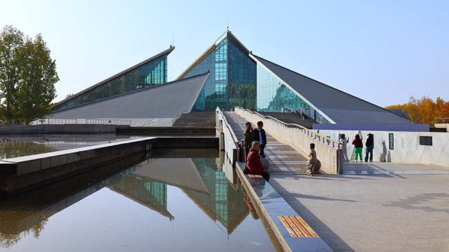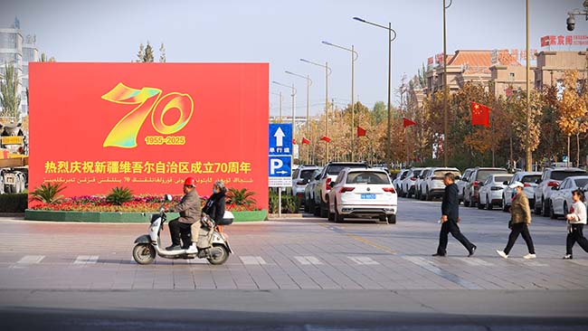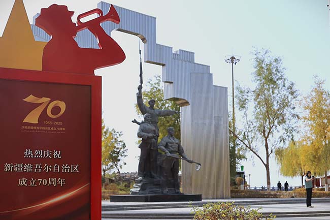 10月25日,三五九旅屯垦纪念馆广场前市民正在休闲。三五九旅前身为红六军团,1937年改编为八路军120师359旅参与抗战,1941年开展南泥湾大生产运动,1949年挺进新疆平叛剿匪,1953年整编为中国人民解放军新疆军区农业建设第一师,最终扎根塔克拉玛干沙漠开展屯垦戍边。