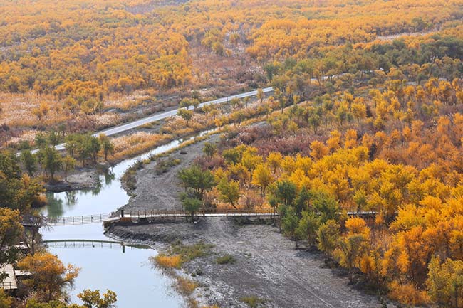 10月23日,一师十六团塔河源景区观光塔上远眺美景。景区位于塔里木河干流起点,是国家AAAA级旅游景区,也是第一师阿拉尔市“百里画廊”的起点。