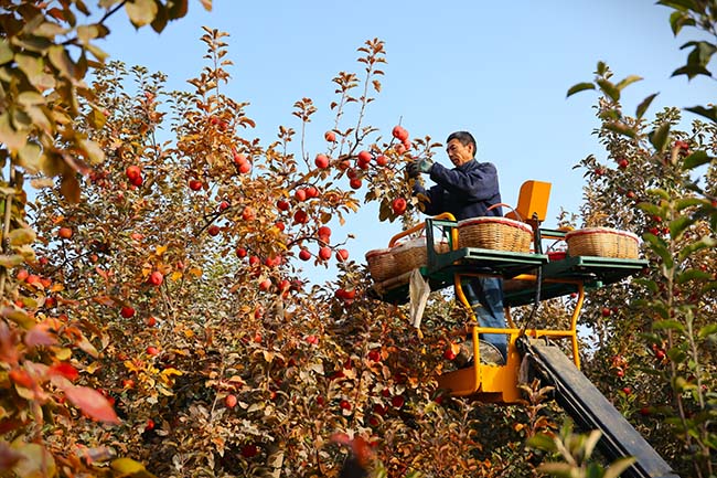 10月23日,一师六团的苹果种植园内,工作人员正借助机械化升降机采摘苹果。该团苹果种植面积4.1万亩,2025年预计产量13.99万吨,预计产值8.39亿元。