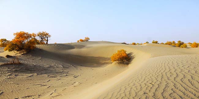 10月23日,新疆生产建设兵团第一师阿拉尔市的沙漠公路深处,金色胡杨点缀下的塔克拉玛干沙漠风景如画。