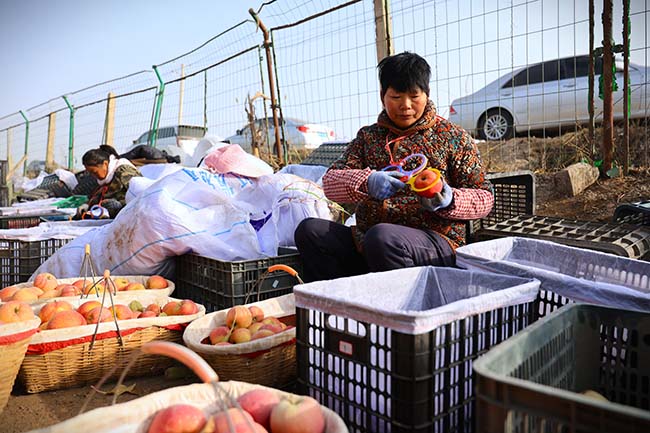工作人员现场测量苹果大小并进行分装。