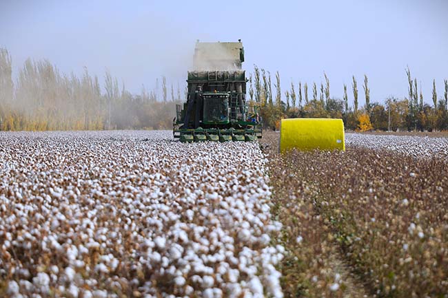 10月25日,一师十二团的大型机械化采棉机正在作业。2025年,一师通过全面实施干播湿出技术,抓实关键技术要求,预计棉花单产482.98公斤,较2024年增加29.9公斤。