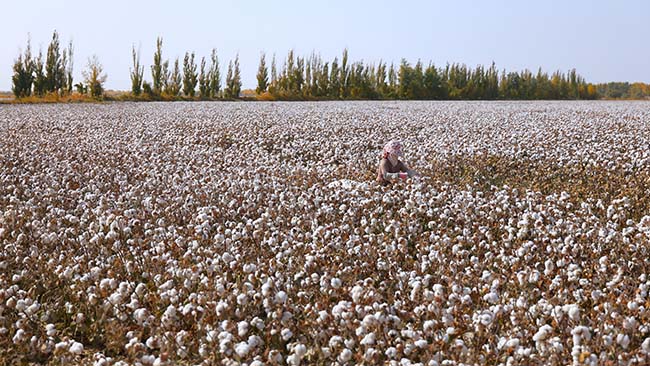 10月25日,一师十二团的棉花种植地,工作人员正在进行采摘作业。