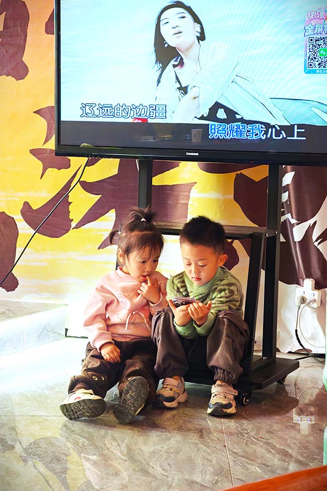 10月25日,阿拉尔市一家餐厅内,两个小朋友正幸福地享受童年时光。
