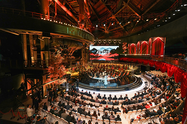 10月11日,2025北京西山永定河文化节在首钢园三高炉盛大开幕。本届文化节以“山河永定·家国长安”为主题,紧扣纪念中国人民抗日战争暨世界反法西斯战争胜利80周年、“两山理论”提出20周年、中国科技创新发展实现新跨越,以红色革命基因为魂、以绿色生态发展为脉、以蓝色科技创新为翼,在西山永定河的山水画卷中,铺展中华民族众志成城的精神传承,勾勒面向未来的创新图景。本届高炉音乐会在艺术呈现与技术运用上实现多重突破,通过灯光投影技术,让高炉本身成为“叙事载体”。同时,高炉内部设置环绕音响系统,营造出“身临其境”的声场效果,观众在声与光的包裹中沉浸式感受历史与时代的对话。图为演出现场。(张雨/文 乔智玮/摄)