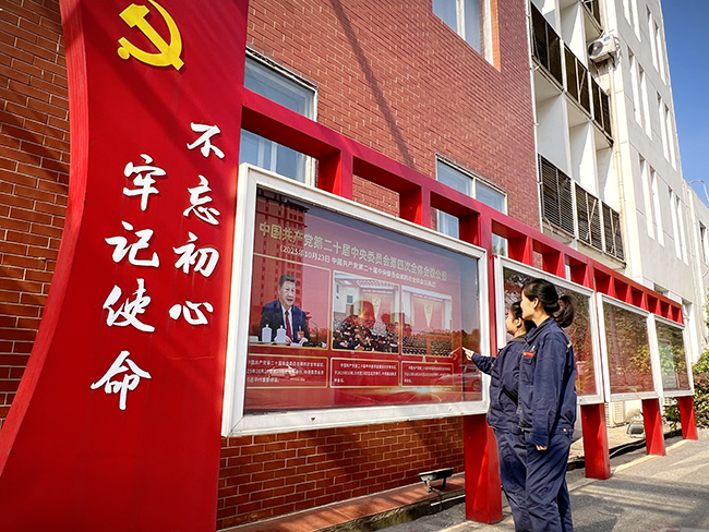 10月20日至23日,中国共产党第二十届中央委员会第四次全体会议在北京举行。全会公报发布后,方大九钢全体党员和干部员工第一时间通过微信转发全会公报,并在宣传栏醒目位置张贴全会公报内容,广大员工通过观看宣传栏、组织召开集中学习会、开展党员每周思想政治学习等方式,第一时间全文学习全会内容,深入理解全会重要精神。与此同时,该公司结合年度重点工作任务和岗位实际,做到“真学真懂真信真用”,力求将学习成果转化为推动工作的具体方案,确保全会精神落地见效。图为方大九钢职工利用工余时间观看宣传展板。(欧青/文 黄小明/摄)