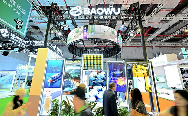 11月5日,中国宝武党委书记、董事长胡望明出席第八届中国国际进口博览会暨虹桥国际经济论坛开幕式,并到宝武展台参观指导。11月8日下午,宝武在上海国家会展中心举办国际采购集中签约仪式,宝武党委常委、副总经理费鹏出席活动并致辞。11月8日,中国宝武进博会展台人头攒动(如图)。从2018年到2025年,中国宝武累计与20多个国家的优秀企业深化合作,每年都从世界各地采购智能高端装备、大宗原料、金属材料,进博会上宝武全球“购物车”引来八方来客。(特约通讯员 张勇 摄)