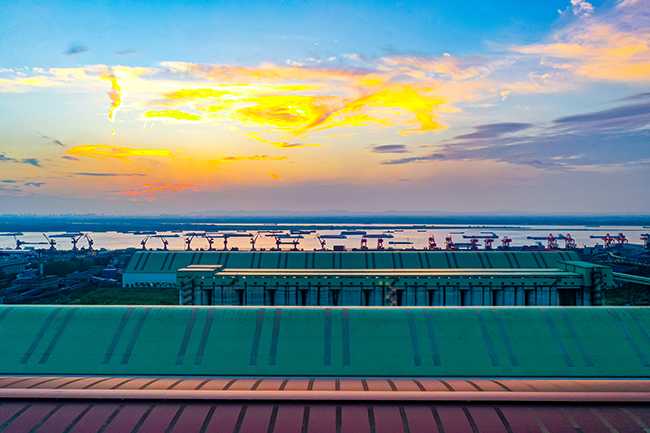 11月7日,位于长江岸边的中国宝武马钢原料封闭料场与桥架、船只绘就出一幅“水清岸绿产业优”的美丽画卷。近年来,马钢持续推进厂区环境综合整治,通过降碳、减污、扩绿、增长,大力推广绿色低碳新工艺、新技术、新装 备、新标准,不断提高发展含“绿”量,成为安徽省第一家完成A级环境绩效创建的钢铁企业。今年上半年,马钢有限固废综合利用率达100%,其中返生产利用率达29.72%,同比增长5%,创历史新高。(陈亮 摄)