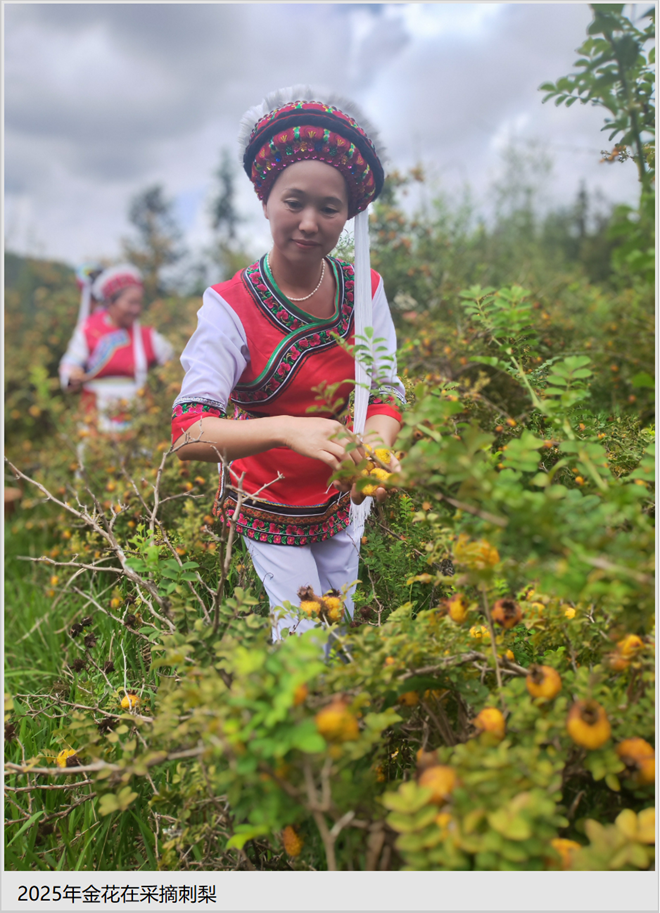 我叫金花,是贵州省盘州市刘官街道三角田村人,也是村里的宣传委员、妇女主任。我家主要种植玉米和刺梨,原来由于没有产业路、灌溉沟渠等基础设施,玉米和刺梨每亩收入只有五六百元。直到鞍钢集团攀钢的帮扶干部来到我们村后,带领大家精细化管控刺梨种植,现在平均每亩刺梨收入在4000元以上。