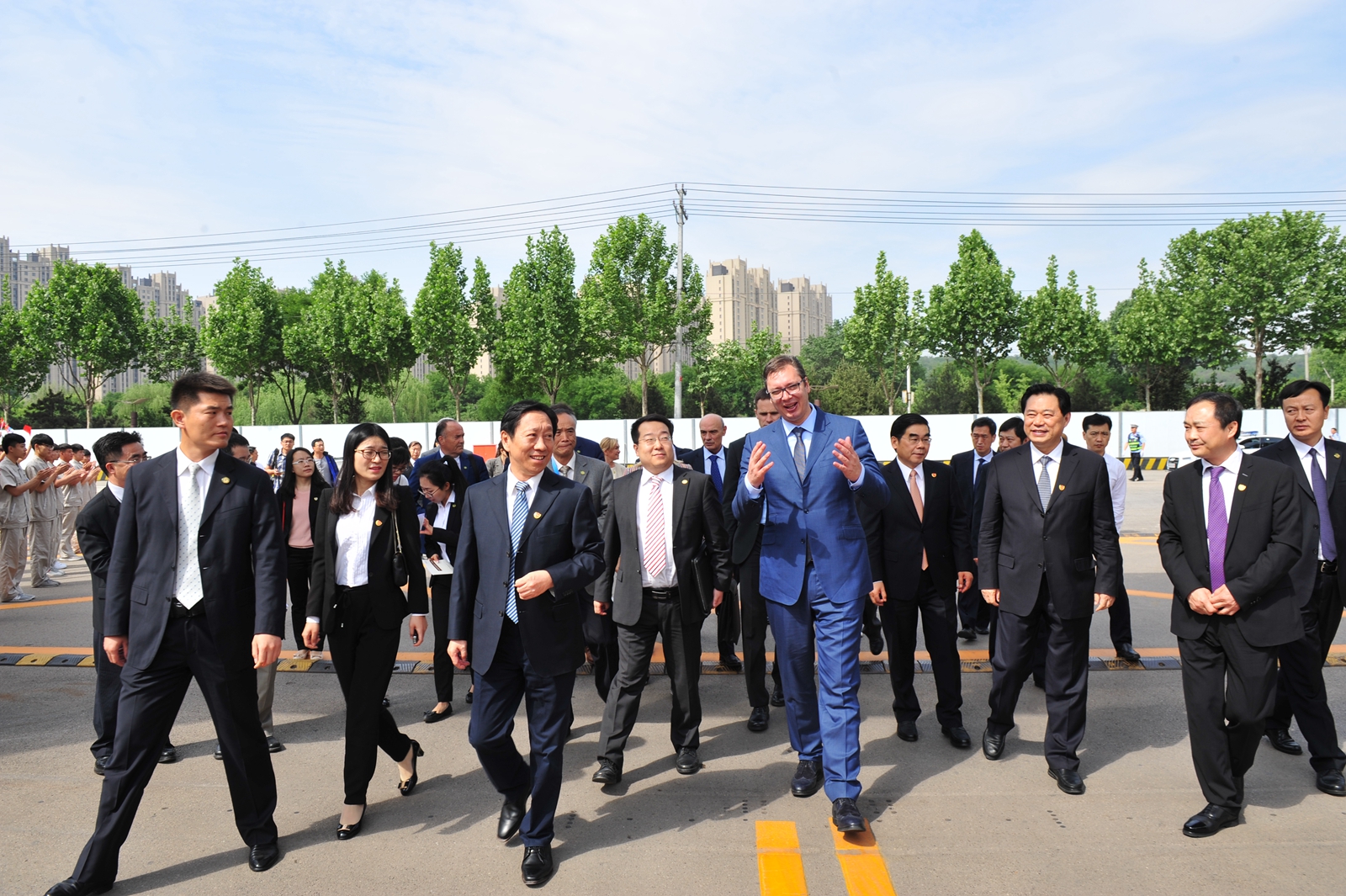 2017年5月17日,河钢集团党委书记、董事长于勇(左三)接待塞尔维亚时任总理、现任总统武契奇访问集团,并陪同参观被誉为“世界最清洁钢厂”的河钢厂区。(周立成 摄)