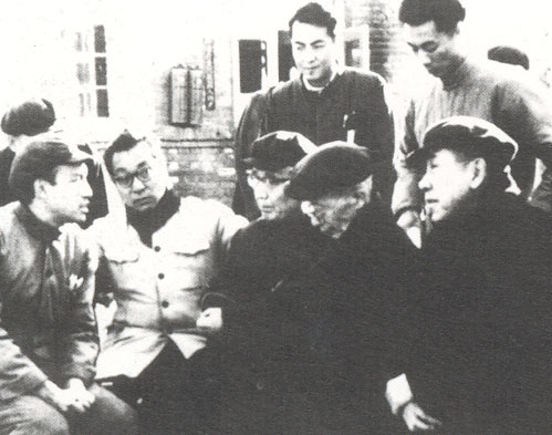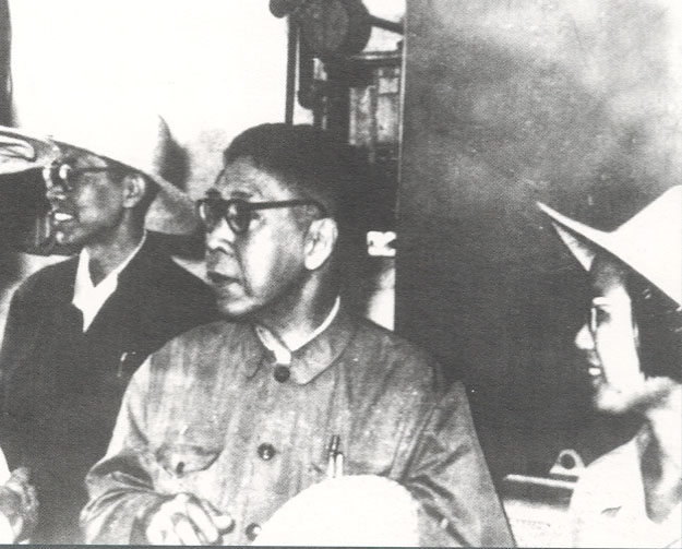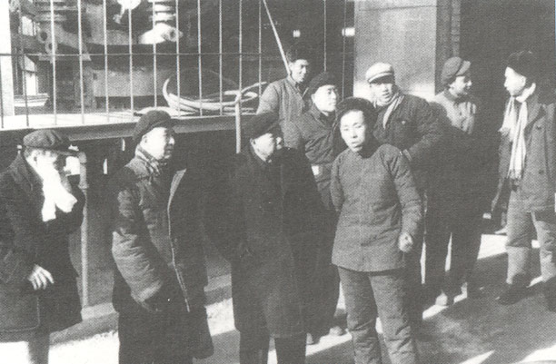 1965年叶渚沛所长(左一)陪同郭沫若院长(前排左三)、竺可桢副院长视察高炉炼磷试验