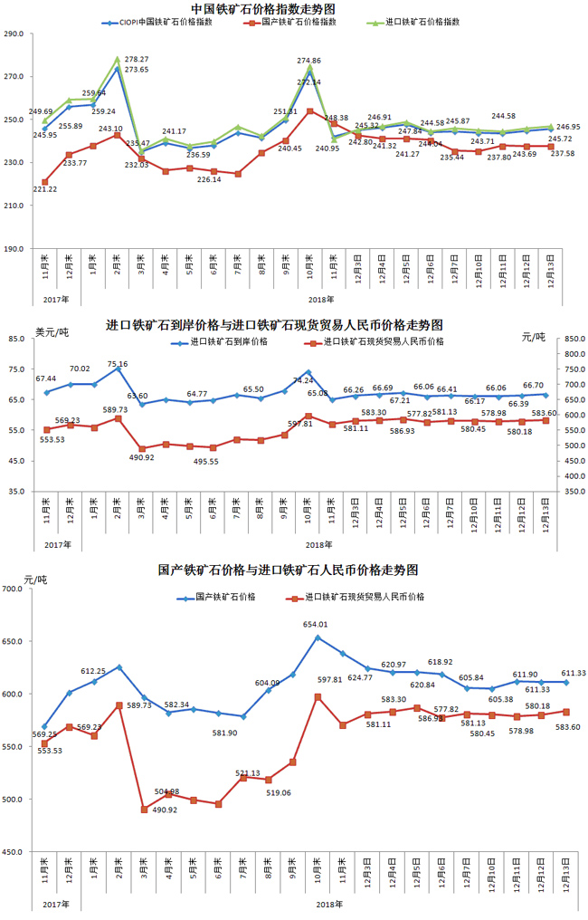 12月13日,中国铁矿石价格指数(CIOPI)245.72点,环比上升1.00点,升幅为0.41%。其中:国产铁矿石价格指数为237.58点,环比持平;进口铁矿石价格指数为246.95点,环比上升1.15点,升幅为0.47%。