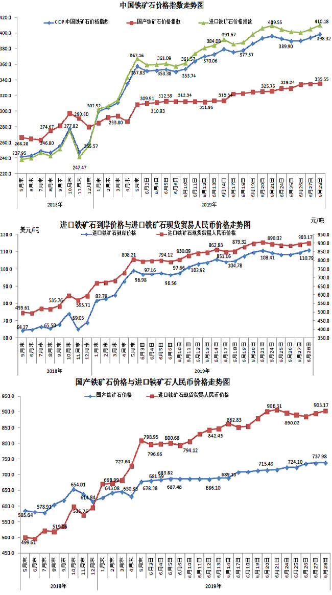 6月28日,中国铁矿石价格指数(CIOPI)398.32点,环比上升4.35点,升幅为1.11%。其中:国产铁矿石价格指数为335.55点,环比上升0.36点,升幅为0.11%;进口铁矿石价格指数为410.18点,环比上升5.11点,升幅为1.26%。