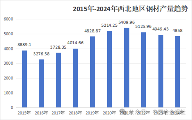 国家统计局数据显示,2015-2024年,西北五省(陕西、甘肃、青海、宁夏、新疆)钢材产量呈现“先增后稳”趋势:2015 年总产量3889.1万吨,2021年达到峰值5409.96万吨,2024年回落至4858万吨,整体符合国家钢铁产业“去产能、优结构”的导向。