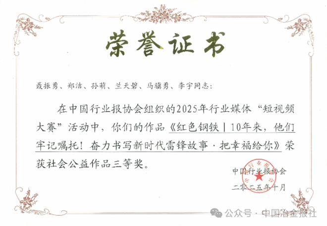 会上,中国冶金报社“冶金文苑”微信团队创作的作品《红色钢铁丨10年来,他们牢记嘱托!奋力书写新时代雷锋故事·把幸福给你》(主创人员聂振勇、郑洁、孙萌、兰天碧、马骥勇、李宇2024年12月30日),获得本次大赛“社会公益作品”三等奖。