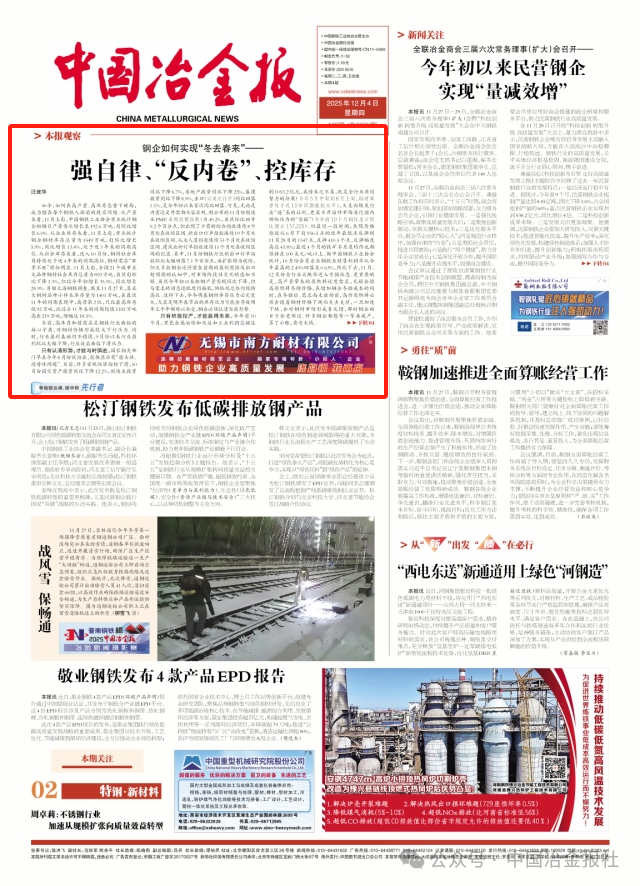 只有反对“内卷”,才能和谐共生。2024年7月末召开的中共中央政治局会议首次提出要强化行业自律,防止“内卷式”恶性竞争。今年全国两会明确提出综合整治“内卷式”竞争。然而,即使今年上半年钢材库存一度处于历史同期最低水平,钢材价格也仍有一段时间“跌跌不休”。7月1日,中央财经委员会提出依法依规治理企业低价无序竞争。当前钢铁行业如此高比例的亏损,不能说不是一些企业无视中央“反内卷”精神的直接体现。不过也有一些积极现象,如在区域钢铁企业积极控产的共同努力下,最近几个月,广东市场不同品种规格的螺纹钢价格反弹150元/吨~200元/吨,值得学习借鉴。“反内卷”不是一家企业的事,也不是一个地区的事,是全行业的事。进入“十五五”,钢铁行业减量发展的压力仍不小,节能减排的任务也不轻。钢铁企业必须积极贯彻落实中央精神,高举“反内卷”旗帜,认真践行“三定三不要”经营原则,真正实现“冬去春来”。