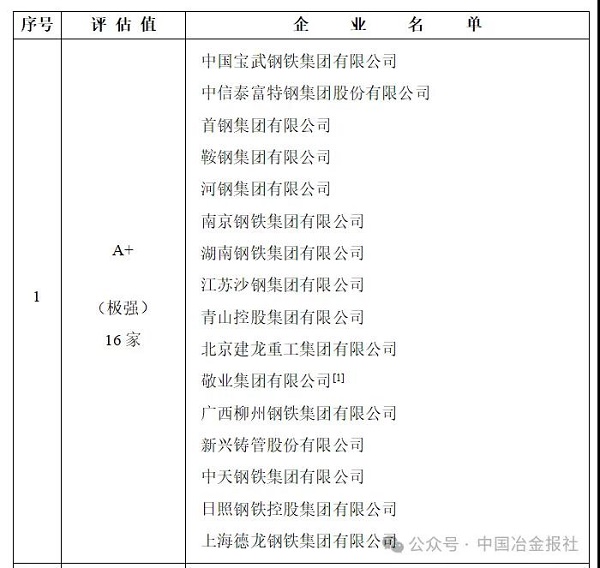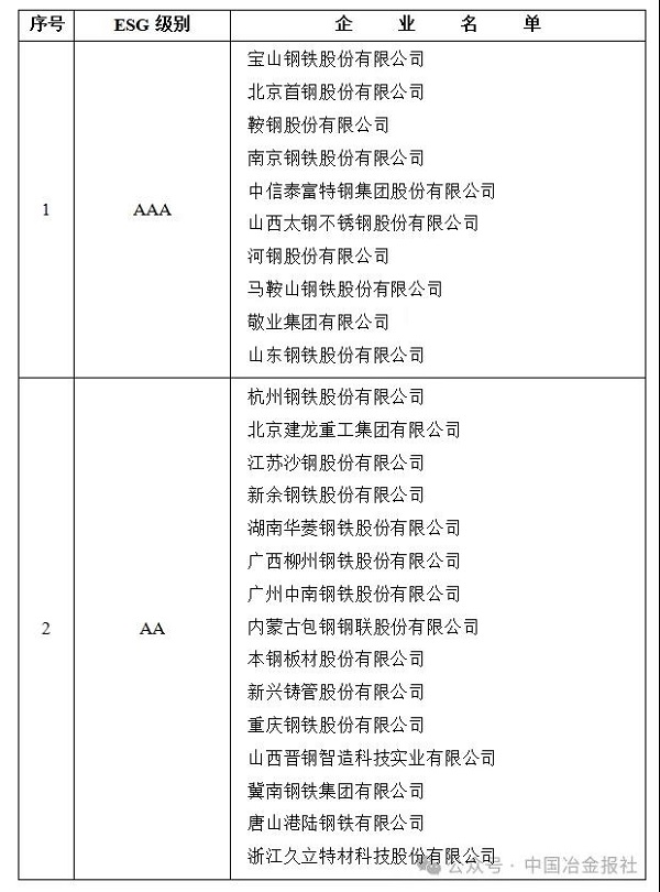 该院发布的2025国内钢铁企业ESG评级结果显示,宝钢股份、首钢股份、鞍钢股份、南钢股份、中信泰富特钢、太钢不锈、河钢股份、马钢股份、敬业集团、山钢股份10家钢企获评为AAA级,杭钢股份、建龙集团、沙钢股份、新余钢铁、华菱股份、柳钢股份、中南股份、包钢股份、本钢板材、新兴铸管、重钢股份、晋钢智造、暨南钢铁、港陆钢铁、久立特材15家钢企获评为AA级(详见表4)。
