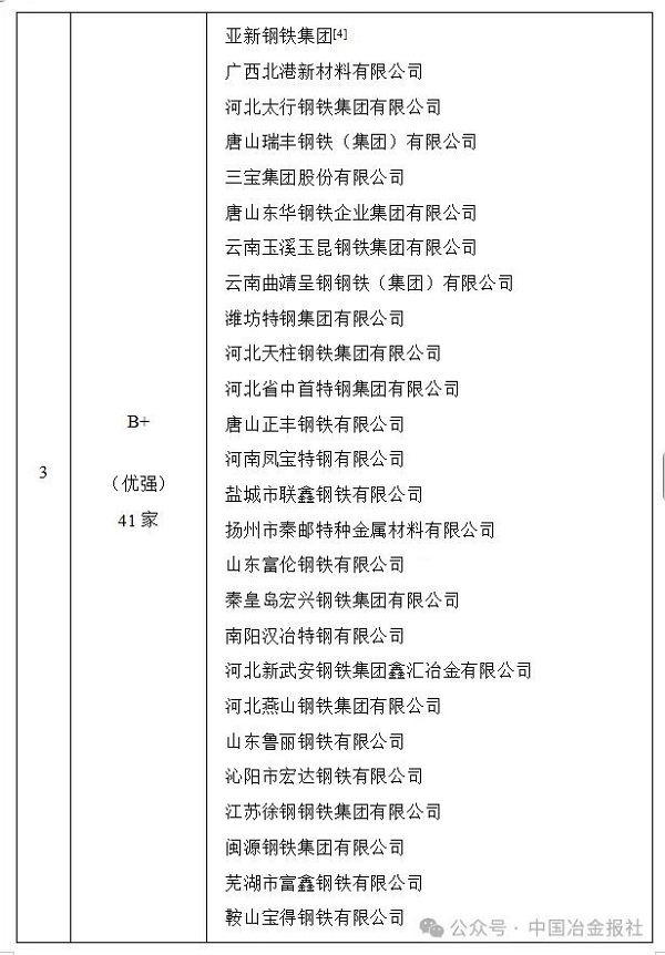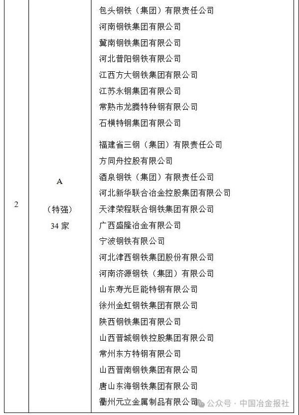 根据该院发布的中国钢铁企业竞争力(暨发展质量)评级(2025)榜单,中国宝武、中信泰富特钢、首钢集团、鞍钢集团、河钢集团、南钢集团、湖南钢铁集团、沙钢集团、青山集团、北京建龙集团、敬业集团、柳钢集团、新兴铸管、中天钢铁、日照钢铁控股集团有限公司、上海德龙钢铁集团16家钢企被评为A+(极强)钢企,另有34家钢企被评为A(特强)级,41家钢企被评为B+(优强)级(详见表3)。今年的A+、A级钢企数量分别较去年下降2家、1家,但合计粗钢产量占全国总产量的比重基本持平,冶金规划院专家回应称,这主要是因为产业集中度的提升,以及近两年钢企经营数据普遍不及预期。