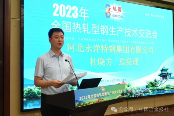 图为杜晓方在全国热轧型钢生产技术交流会做报告。