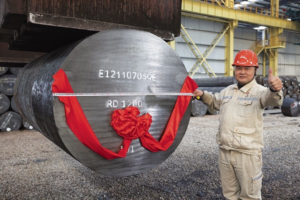 2021年12月13日12点38分,在中信泰富特钢集团旗下兴澄特钢二炼钢分厂生产出直径1200毫米世界最大规格的连铸圆坯(如图)。据了解,此次生产的连铸大圆坯,主要用于我国风电等清洁能源、大型机械装备、锻造行业、重要的高端特钢等领域。 (特约通讯员 陆卫宇 摄)