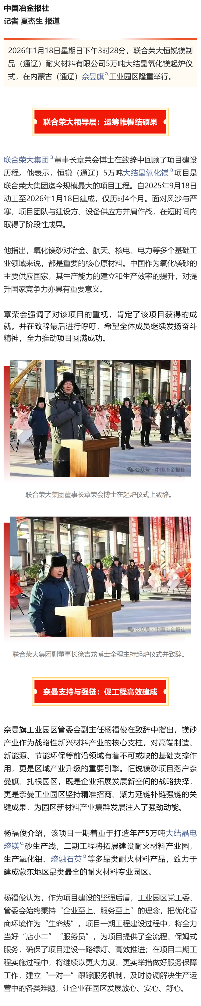 四个月建成 创造令人惊叹的“通辽速度”——联合荣大恒锐(通辽)5万吨大结晶氧化镁项目起炉仪式侧记