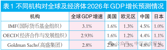 IMF(国际货币基金组织)在2025年10月发布的《世界经济展望报告》中预测,2026年全球GDP增长率为3.1%,低于2025年3.2%的增速;高盛则预计2026年全球GDP增长率为2.8%;世界银行2026年1月发布的《全球经济展望》中,预计全球经济增长2.6%;OECD(经济合作与发展组织)预测2026年全球经济增长率为2.93%,较2025年的3.25%有所回落。
