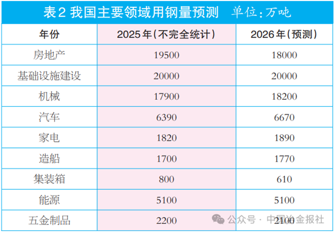 考虑到2026年为我国“十五五”开局之年和一系列扩消费政策出台等情况,2026年,我国钢材需求降幅有望收窄,同比下降1%左右,全年需求预计在8亿吨左右。我国钢铁行业下游分领域用钢量详见表2。