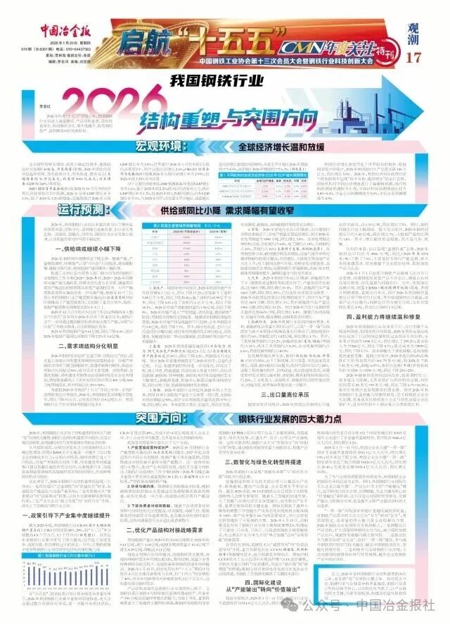 总之,2026年是我国钢铁行业结构重塑的深化之年,也是破“卷”突围的关键之年。面对需求分化、低碳约束与全球竞争的多重挑战,钢铁行业需以科技创新为核心,以结构优化为抓手,以产业链协同为支撑,突破发展瓶颈,推动高质量发展新格局。(苏亚红)