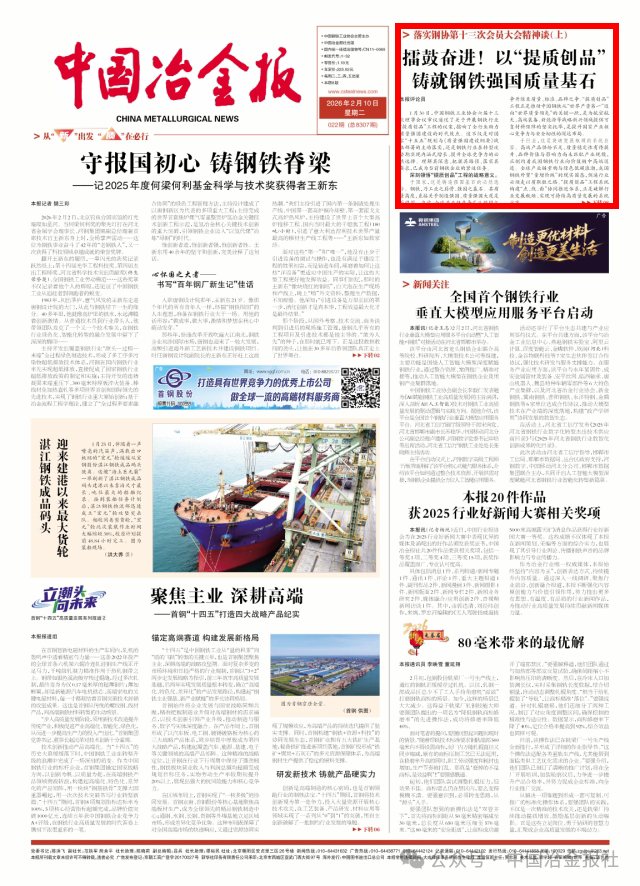 1月30日,中国钢铁工业协会六届十三次理事会议审议通过了关于开展钢铁行业“提质创品”工程的议案,擂响了全行业助力质量强国建设的时代鼓点。这不仅是对国家“十五五”规划与《质量强国建设纲要》战略部署的主动落实,还是钢铁行业在转型攻坚期实现内涵式增长、提升全球竞争力的必然选择。理解其深意、把握其路径、落实其要求,已成为当前钢铁企业的紧迫任务。