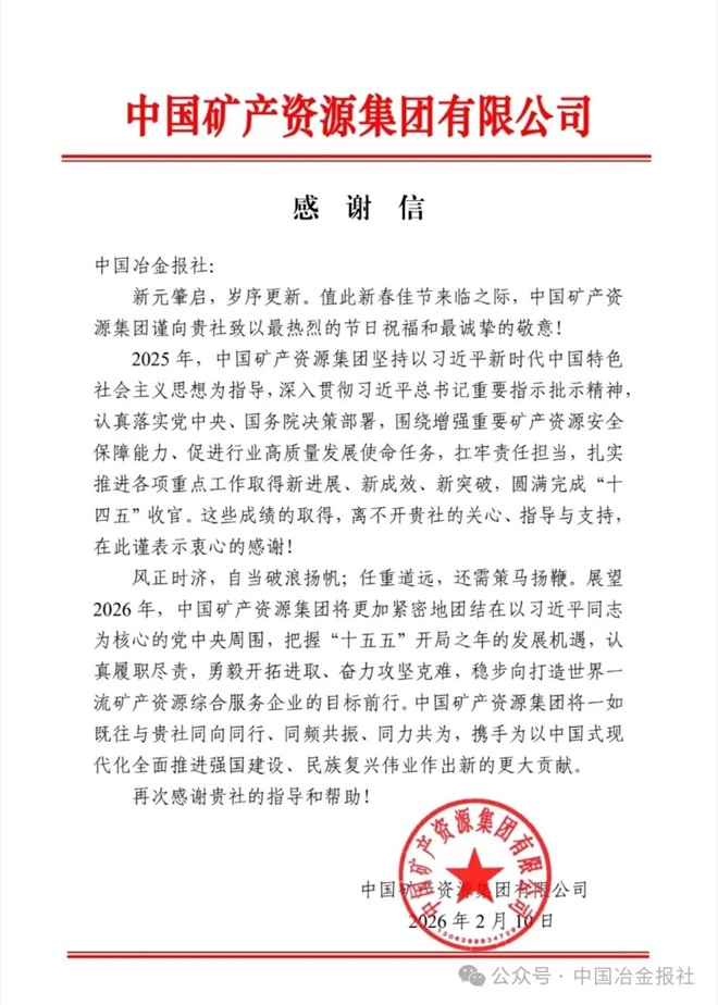 中国矿产资源集团有限公司向中国冶金报社发来感谢信