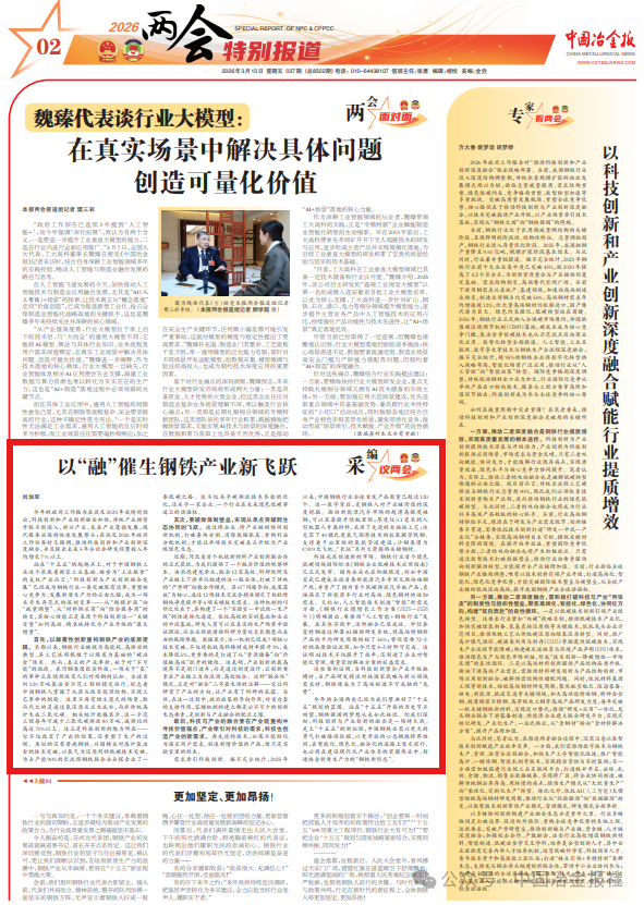 今年的全国两会已经为我们擘画好了“十五五”规划的蓝图。站在“十五五”开局的历史节点回望,钢铁强国的梦想从未如此接近。但我们深知,科技创新与产业创新的融合是一场持久战。走上“十五五”的新征程,中国钢铁业需以更大的勇气打破路径依赖,以更开放的心态拥抱跨界协同,在智能化、绿色化、融合化的道路上坚定前行,也必将在建设现代化产业体系的宏图伟业中,创造饱含新质生产力的“钢铁新形态”。