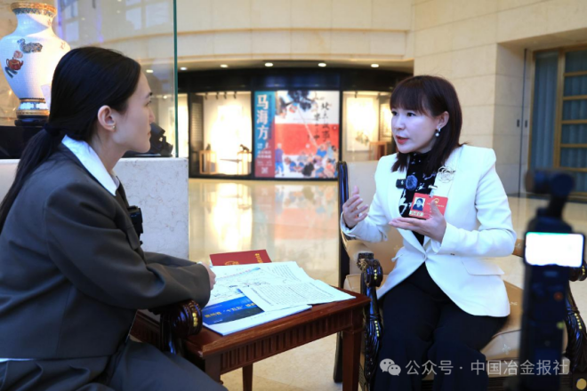 张尤慧代表与《中国冶金报》记者交流,桌面摆放了满满的调研材料