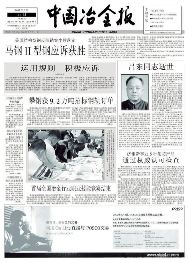 马钢打赢这场中国钢铁“洋官司”,立即引起中国冶金报社驻安徽记者站(马钢记者站)的密切关注。2002年5月31日,我与时任站长郭启林迅速与参与应对反倾销团队公司法律处、外事处、生产部、销售公司、H型钢厂相关人员进行面对面采访与沟通,一连数天搜集素材,了解各种应对方法和手段。随后,马钢记者站记者进行了仔细琢磨、反复推敲、精细整理后,将消息《美国结构型钢反倾销案尘埃落定 马钢H型钢应诉获胜》和综述《如何取胜——马钢积极应诉美国H型钢反倾销调查综述》发到报社,编辑部不吝版面于2002年6月7日头版头条予以刊登。稿件见报后,在行业和社会各界引起极大反响。