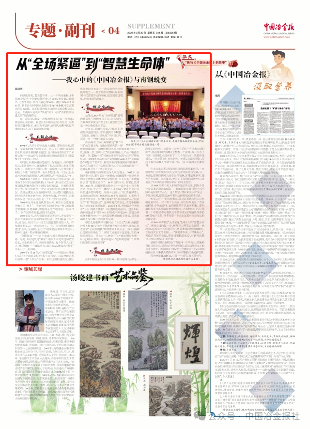 作为企业记者,我深知自己肩负着双重责任:一方面要为行业发展鼓与呼,记录企业的探索与突破;另一方面也要保持新闻人的专业与冷静,客观呈现事实、理性分析问题。这些年来,我见证了南钢的起伏跌宕,也见证了《中国冶金报》始终如一的专业坚守。