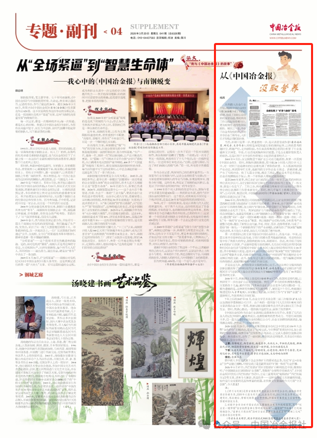 《中国冶金报》作为冶金行业新闻信息载体和文化平台,承载了几代冶金人的记忆和情怀,赋能我成长,也激励着我的思考动力。尽管后来投稿不多,但一直关注着《中国冶金报》微信公众号、冶金文协群里的新消息,每周都会浏览,俨然成了一份情感寄托。