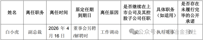近日,中国中冶董事会收到执行董事、副总裁白小虎先生的书面辞职报告,因工作调动,白小虎先生请求辞去该公司副总裁职务,辞职后白小虎先生仍担任公司执行董事职务。