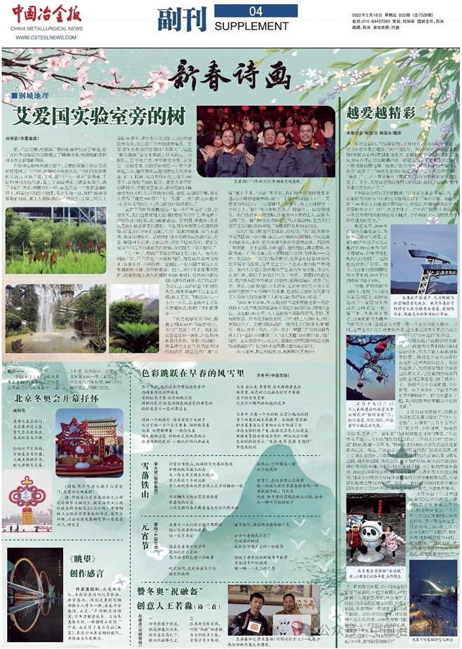 正因为如此,我一直对《中国冶金报》情有独钟,阅读报纸,必然先看她。她的副刊还是一样吸引我,而且还不时地想着给她投稿。不管编辑怎么变换,不影响我在她的副刊间或发表一点文章的热情,比如近期的《艾爱国实验室旁的树》《难忘办团刊的那些日子》等,都上了《中国冶金报》副刊头条。