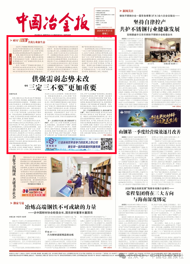 钢铁行业的高质量发展,从来不是某一家企业的单打独斗,而是全行业的同心同向、协同发力。唯有全行业以务实之举践行“三定三不要”经营原则,以协同之力破解供强需弱矛盾,把行业自律内化为企业自觉行动,才能推动钢铁行业真正实现高质量发展。
