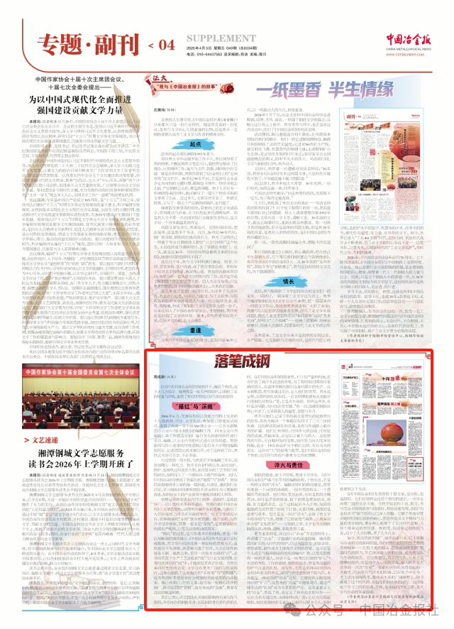 如今,我虽然离开钢厂、离开冶金行业,已不再撰写冶金相关的新闻报道,但《中国冶金报》所给予我的那种精神——扎根大地的踏实、百炼成钢的坚韧、锻造时代的担当,早已深深融入我的血脉,成为我写作与生命的底色。它让我相信,真正的写作,从来不是缥缈的孤鸣,而是将个人心灵的淬炼,融入时代宏大叙事的一次次“冶金”。那最初在报纸角落亮起的一点微光,经由岁月与汗水的熔铸,已在我手中化为一支力求沉甸甸的笔,继续在生活的广阔原野上,探寻着属于这个时代的、有温度的钢铁般的诗行。这份缘起于方寸之间的恩遇,于我,是永远的淬火之源,是文字与生命的双重锻造。