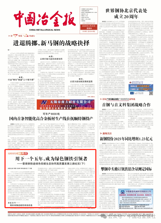 “从2026年开始,通过5年努力,我们要成为绿色钢铁引领者。”日前,晋南钢铁总裁张天福向《中国冶金报》记者谈及企业“十五五”时期在绿色低碳方面的规划时,信心满满。