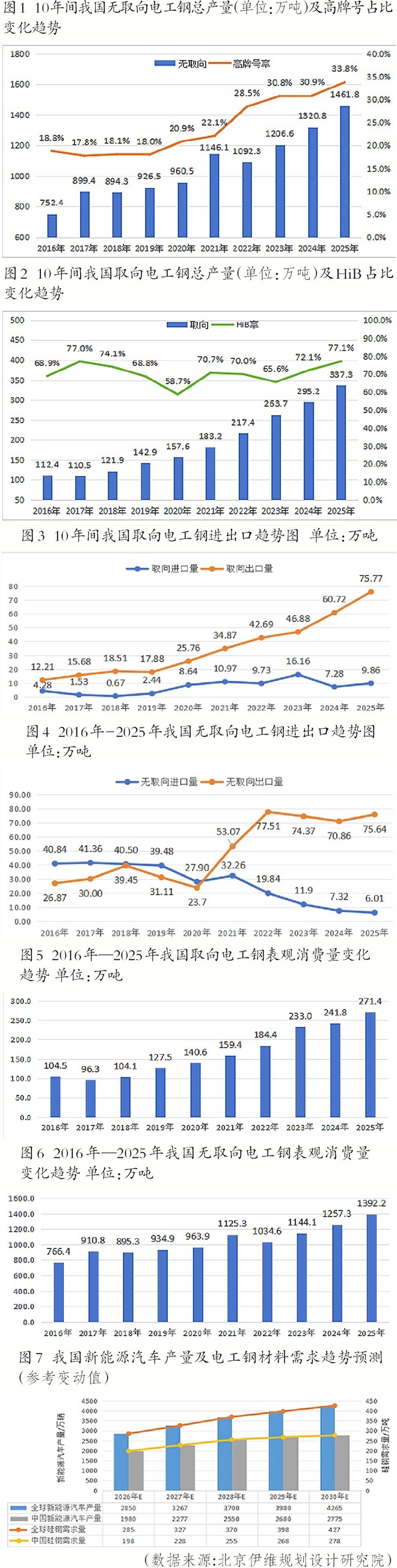 “十四五”,我国高磁感取向电工钢在取向电工钢总产量中的占比为77.1%,高牌号无取向电工钢在无取向电工钢总产量中的占比为33.8%。5年间,新能源汽车高牌号无取向电工钢和高磁感取向电工钢产量逐年增长。其中,高牌号无取向电工钢产量从2021年的34.8万吨增长至2025年的146.8万吨,增幅为76.29%;高磁感取向电工钢产量从2021年的118.92万吨增长至2025年的260.2万吨,增幅为54.29%。