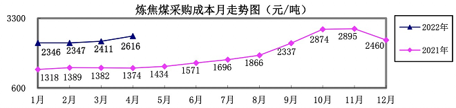 2022年4月,煤焦和铁矿石、废钢采购成本继续上升。