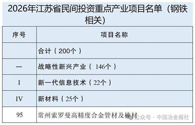 近日,江苏省发展改革委发布2026年江苏省重大项目名单、2026年江苏省民间投资重点产业项目名单。其中,钢铁项目整理如下: