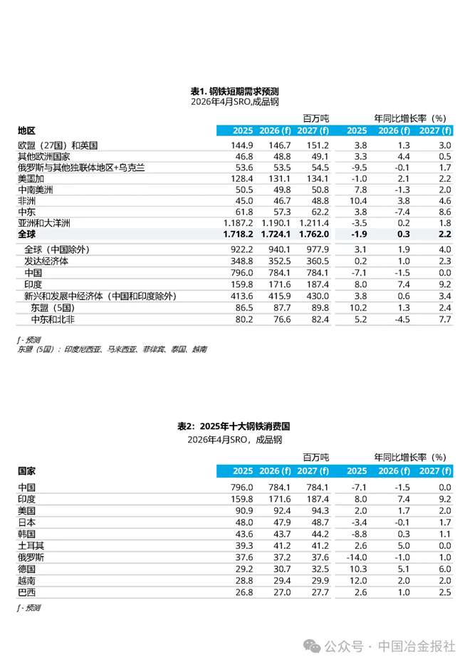 发展中经济体(中国除外)的钢铁需求增长预计将在2026年适度增长2.5%,这与近年约5%的年增长率相比显著放缓。这一降温主要源于中东地区的需求急剧收缩,中东地区的冲突意外地扭转了之前的增长预期。此外,我们预计东盟经济体的需求将正常化;在2025年强劲扩张之后,随着囤货行为的减弱,该地区的增长预计将暂时放缓。尽管如此,预计2027年的增长将更为强劲,增长率将反弹至5.1%。这一复苏主要源于亚洲和非洲发展中经济体的持续增长势头,以及中东地区的预期复苏。