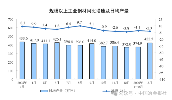 国家统计局数据显示:2026年3月份,中国粗钢产量8704万吨,同比下降6.3%;生铁产量7328万吨,同比下降3.3%;钢材产量13098万吨,同比下降2.3%。