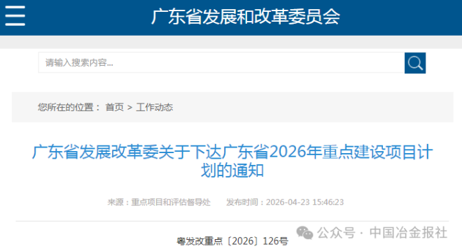 4月23日,广东省发展和改革委员会发布了广东省2026年重点建设项目计划。