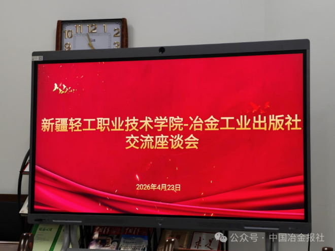 2026年4月23日上午,冶金工业出版社与新疆轻工职业技术学院在图文信息中心会议室联合举办以“凝聚共识,共绘校社合作新蓝图”为主题的教材出版建设战略合作交流座谈会。新疆轻工职业技术学院副校长郭江、冶金工业出版社副社长马文欢等双方领导,专家及骨干教师齐聚一堂,通过战略签约、专题研讨、公益书展等形式,探索产教融合新路径,共筑职业教育教材高质量发展新生态。座谈会由该校能源与材料学院党委书记付国庆主持。